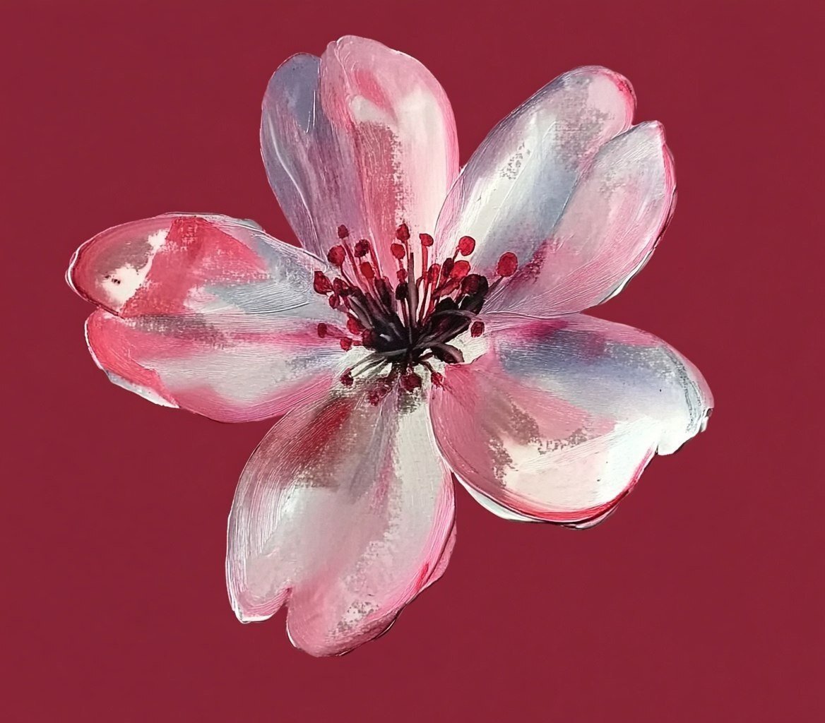 Создано на основе запроса: A single cherry blossom is painted in thick, clear acrylic paint with visible brush strokes on an isolated solid color background. The petals of the flower have a gradient from pink to white, with red highlights along their edges. A large, dark center is filled with a glossy, liquid substance that appears almost translucent, giving it a sparkling appearance. The blossom is centered on its own in front of a flat, burgundy backdrop, with no other elements or textures around it.