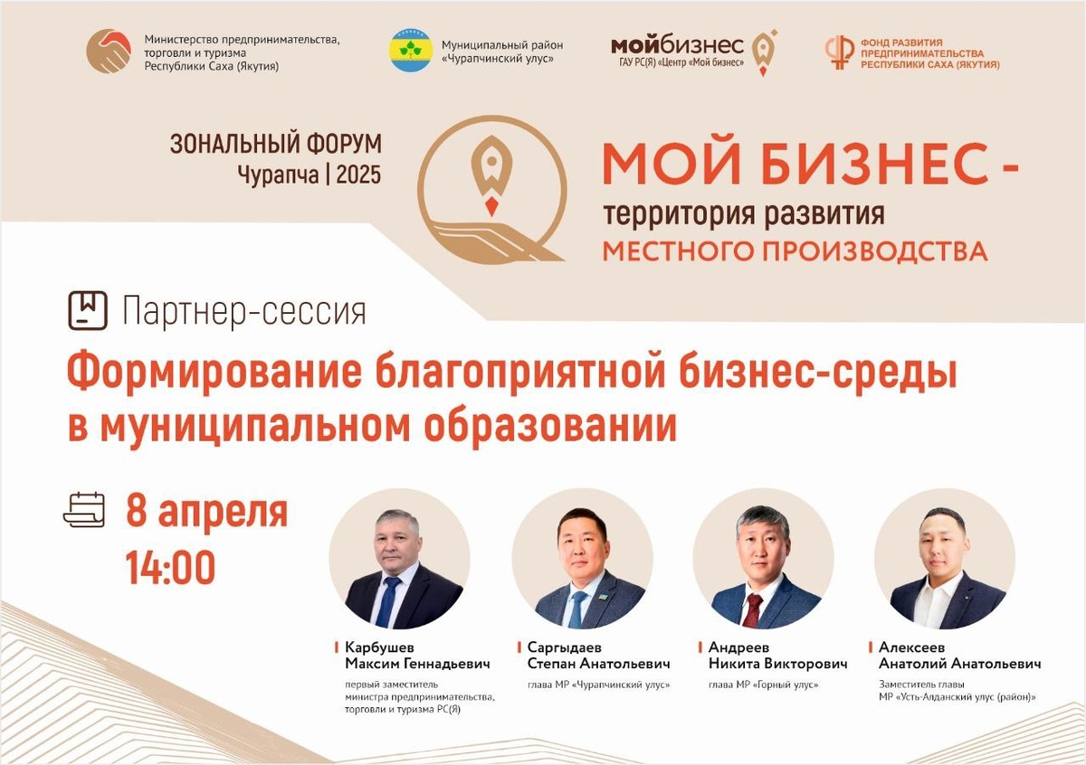 Приглашаем на партнер-сессию «Формирование благоприятной бизнес-среды в муниципальном образовании», которая состоится в рамках форума предпринимателей «Мой бизнес: территория развития местного производства». На сессии планируется обсуждение ключевых аспектов формирования эффективной бизнес-среды, обмен опытом и практиками, а также наработки совместных шагов для поддержки предпринимательства в муниципальных образованиях. Модератор: Максим Карбушев, первый заместитель министра предпринимательства, торговли и туризма Республики Саха (Якутия) Спикеры: 1. Никита Андреев, глава муниципального района «Горный улус» 2. Степан Саргыдаев, глава муниципального района «Чурапчинский улус» 3. Анатолий Алексеев, заместитель главы муниципального района «Усть-Алданский улус» Место: с. Чурапча, ул. Ярославского, д. 18, РДНТ «Айылгы», малый зал Дата: 8 апреля Время: 14:00-15:30 Регистрация для участия доступна по ссылке: https://forms.yandex.ru/cloud/67e26507e010db5dfffe74a6/ Не упустите возможность задат