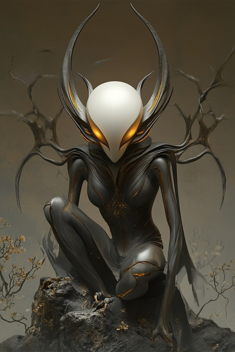 Создано на основе запроса: Horned antler morph, crawling across the tomb of the ancient fiber optic floral owls