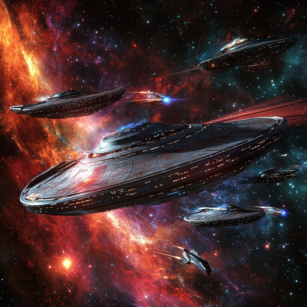 Создано на основе запроса: a fictional starship, in the style of Star Trek, landscape of traveling through space with many stars in the background including several nebulae in different shapes and sizes, add multiple craft in a battle, the main ship from species A surrounded by two other similar but different ships from species B, species A and B ships should be a very different design, shape, style, and color --- Автоперевод: Вымышленный звездный корабль, в стиле Star Trek, ландшафт путешествий по космосу со многими звездами на заднем плане, в том числе несколько туманных в разных формах и размерах, добавьте несколько ремесленных судов в битве, основной корабль от видов, окруженный двумя другими похожими, но разными кораблями из видов B, виды A и B должны быть совершенно разным дизайном, формой и цветом и цветом. Круто выглядит? 🤔 https://dzen.ru/id/65c0c65c86e4f837c27b24d7 #ИИ #AI #нейросеть #midjourney #art