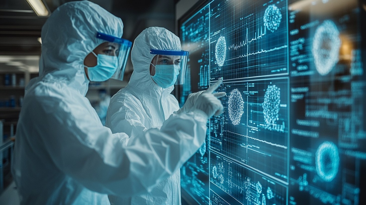 Создано на основе запроса: In a high - tech laboratory setting, two scientists clad in white protective suits, complete with face masks and goggles, are intently studying a large, illuminated digital display. One scientist points at detailed 3D renderings of biological cells and graphs, with various medical and scientific data surrounding the visuals. The environment is well - lit with modern lab equipment in the background, emphasizing a professional and advanced research atmosphere. --- Автоперевод: В высокой технической лабораторной обстановке два ученых, одетых в белые защитные костюмы, в комплекте с масками для лица и очков, наявно изучают большой, освещенный цифровой дисплей. Что скажешь? 🤔 https://dzen.ru/id/65c0c65c86e4f837c27b24d7 #ИИ #AI #нейросеть #midjourney #art