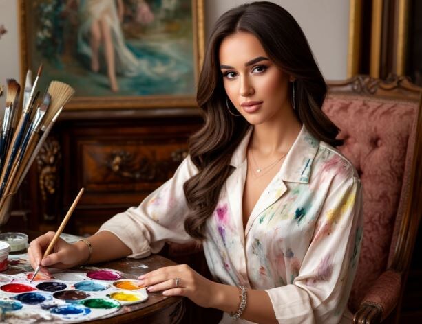 Когда из комнаты появилась сама художница, стало ещё более понятно – она была в светлой блузке, изрядно перепачканной красками.