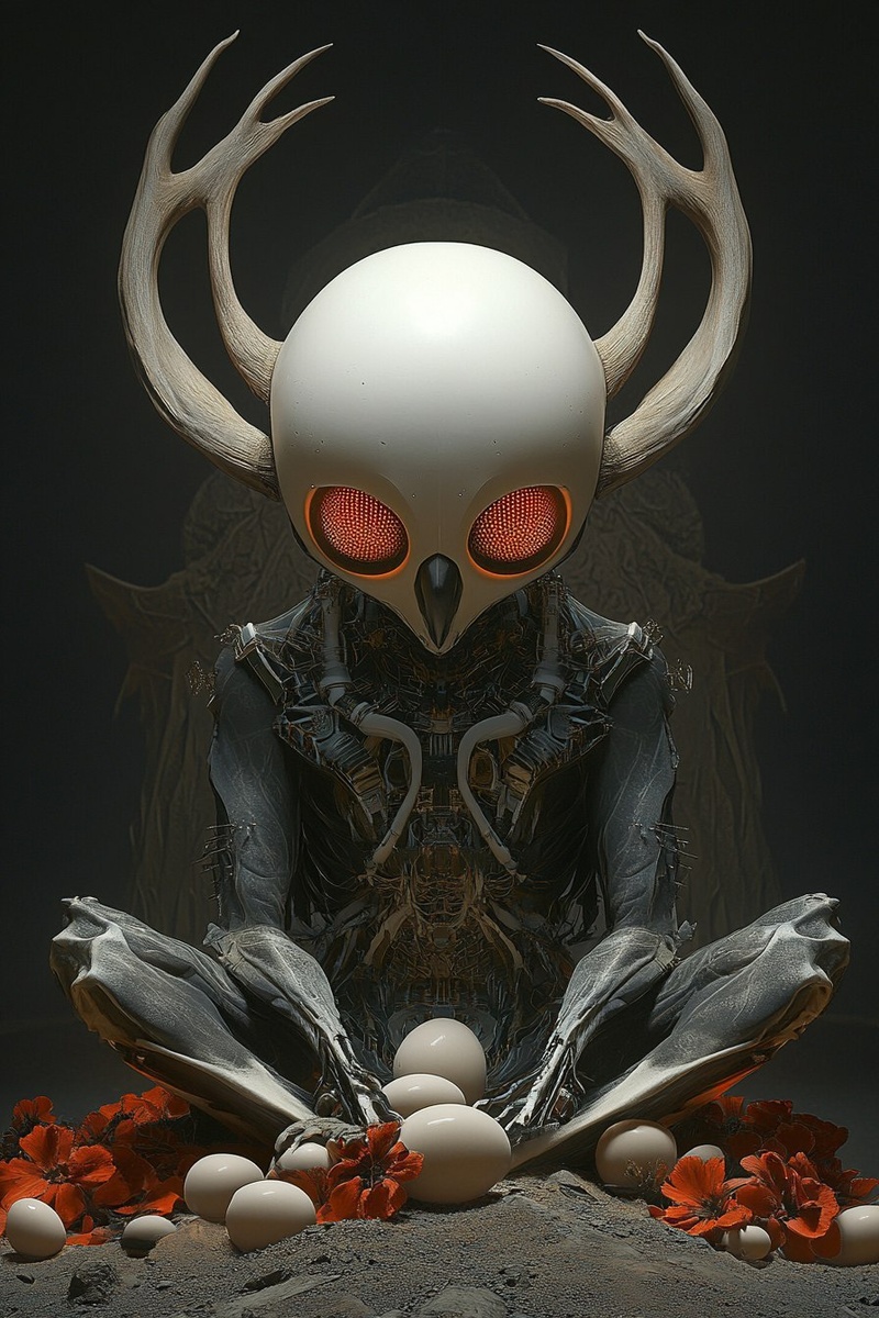 Создано на основе запроса: Horned antler morph, cockroach eggs delightful, crawling across the tomb of the ancient fiber optic floral owls