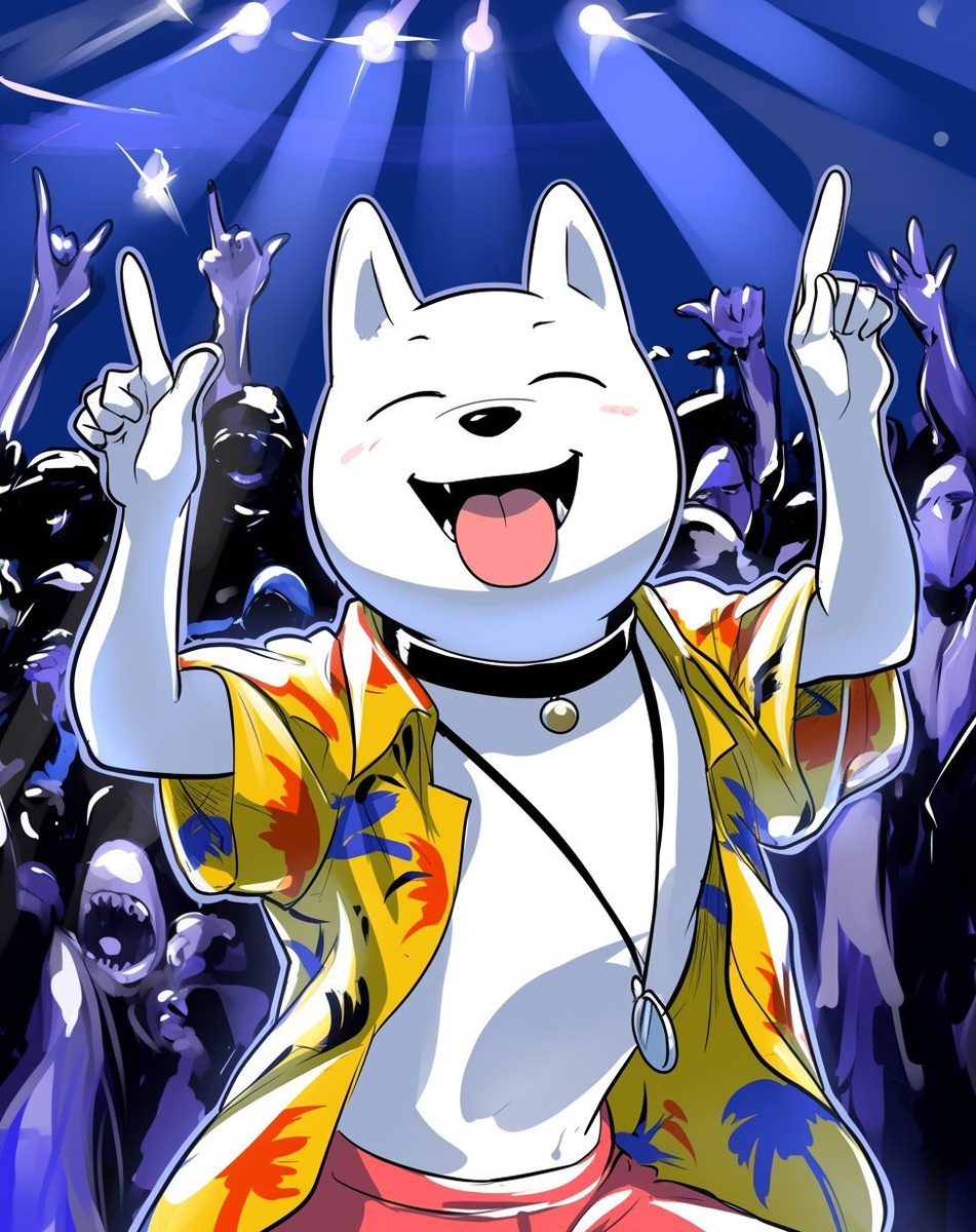 Создано на основе запроса: A white dog, in the style of The Simpsons, is wearing an iridescent yellow Hawaiian shirt & pink shorts, & is smiling. It is at a nightclub with many people dressed as purple aliens dancing around it. The focus is on the dog's face, which has sharp teeth.