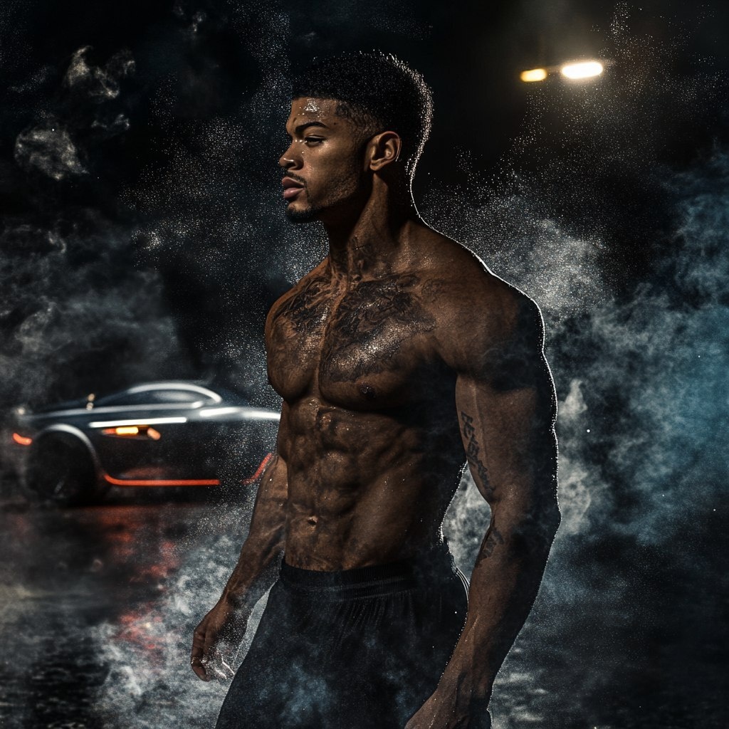 Создано на основе запроса: black man Rome Flynn athletic surrounded by Smoke. Night sky with hyper detailed background. Fast car in background City landscape Canon Eos realistic super realistic