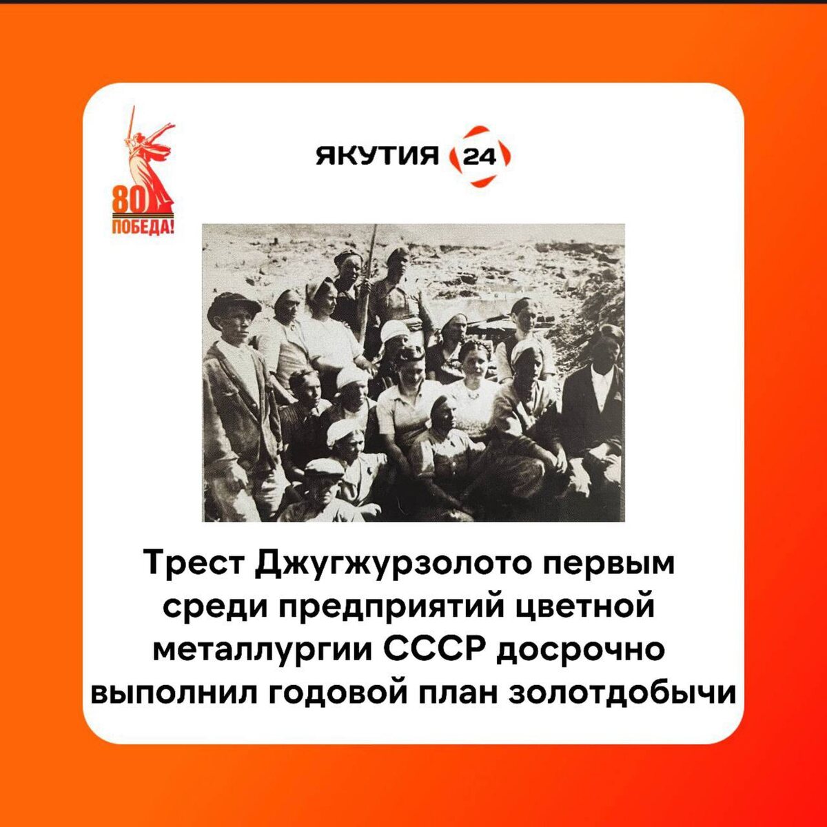 В ответ на пост ⭐️ Путь к Победе: 80 фактов о Великой Отечественной войне Факт №45: Трест Джугжурзолото в 1941 г. первым среди предприятий цветной металлургии СССР к 20 августа досрочно выполнил годовой план золотдобычи Промышленность страны должна была тогда сделать все, чтобы в кратчайший срок ликвидировать превосходства врага в количестве танков и самолетов, Джугджурцы в суровом 1941году успешно справились с поставленными задачами. И это возможным, благодаря их самоотверженному труду и уплотнению рабочего дня в старательских артелях. С началом войны большинство старательских бригад перешло на выполнение всех вспомогательных и подсобных работ в нерабочее время — до и после окончания основанных добычных работ и в выходные дни, что в значительной степени способствовало перевыполнение планов золотодобычи каждой бригадой, ключом, прииском. До Дня Великой Победы осталось 36 дней! #80фактов_о_Победе_Як24 @Якутия 24