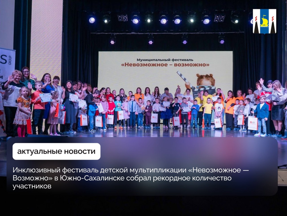 Инклюзивный фестиваль детской мультипликации «Невозможное — Возможно» в Южно-Сахалинске собрал рекордное количество участников В центре народной культуры «Радуга» состоялось торжественное закрытие ежегодного фестиваля «Невозможное - Возможно», ставшего настоящим праздником творчества и инклюзии. Фестиваль «Невозможное - Возможно» организован Департаментом образования администрации города Южно-Сахалинска и проводится уже в шестой раз. Если в первом фестивале участвовало всего 15 команд, то в этом году уже 68 участников из Сахалинской, Амурской, Свердловской областей, Донецкой Народной Республики и Республики Беларусь. В течение 8 дней команды, состоящие из дошкольников в возрасте от 5 до 7 лет и их наставников, работали над созданием уникальных мультфильмов. - Каждый год мы проводим фестиваль в очном, дистанционном и заочном форматах, чтобы коллеги из разных регионов могли присоединиться. Сегодня мы чествуем участников и демонстрируем лучшие, по мнению наших партнеров, мультфильмы. У
