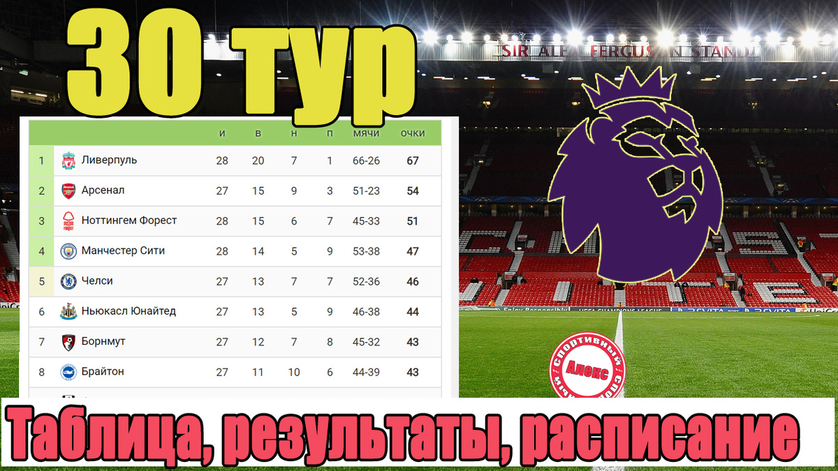 Чемпионат Англии по футболу (АПЛ). Таблица, расписание, результаты. Итоги 30 тура.