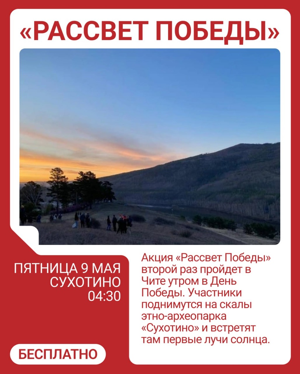 В прошлом году встречать рассвет ходили 300 человек. Акция проходила в Чите и районах края. На скалах Сухотино пели песни «Катюша» и «День Победы». В поход с собой нужно будет взять воду, горячий чай, бутерброды, одежду по погоде и удобную обувь. По информации краевого Минкульта (0+) 🟦Подписаться | Предложить новость