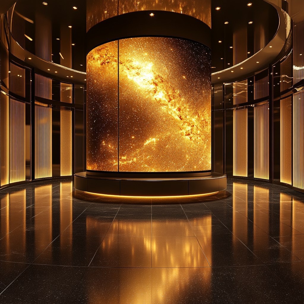 Создано на основе запроса: 360 degree LED screen. gold accents. modern, black shiny floor.