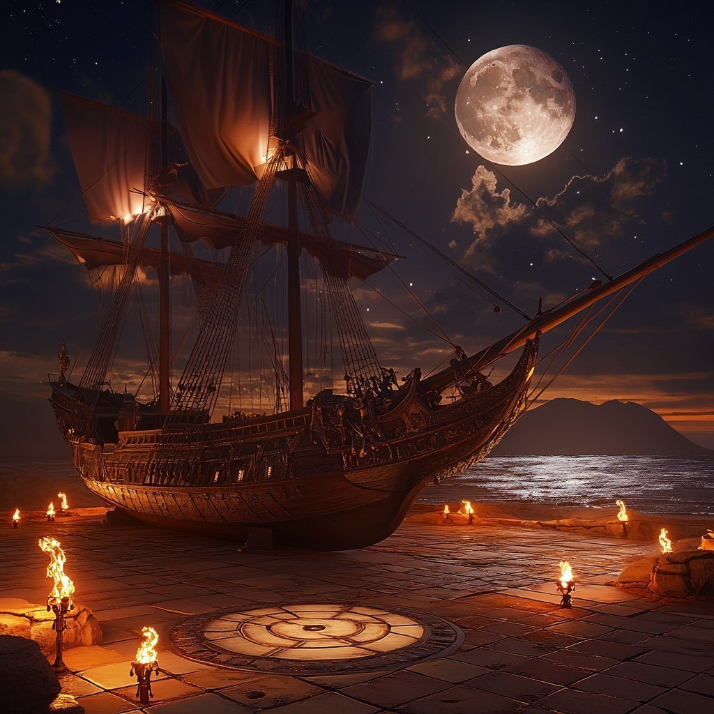 Создано на основе запроса: a large two mast renaissance ship with furled up sails, resting on a sandstone tiles floor terrasse with a ritual circle, lit up by the moon in the night sky and flame sconces placed around the boat, near ruins inside of a walled city in the desert --- Автоперевод: Большое два судно мачты ренессанса с пухлыми парусами, опираясь на террасную напольную плитку из песчаных камней с ритуальным кругом, освещенная луной в ночном небе, и пламени, расположенные вокруг лодки, недалеко от руин внутри города с стеной в пустыне. Классно получилось? 🤔 https://dzen.ru/id/65c0c65c86e4f837c27b24d7 #ИИ #AI #нейросеть #midjourney #art