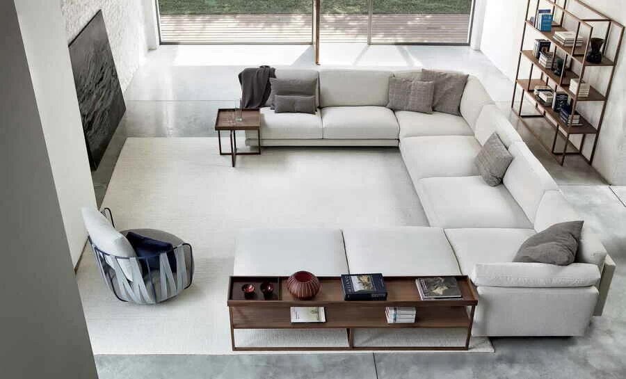 Модульный диван предлагает неограниченные возможности планировки. Вы можете создать угловую, П-образную или островную композицию, а при необходимости - легко изменить расположение секций, освежая интерьер без замены мебели. 2. Идеальная адаптация к пространству