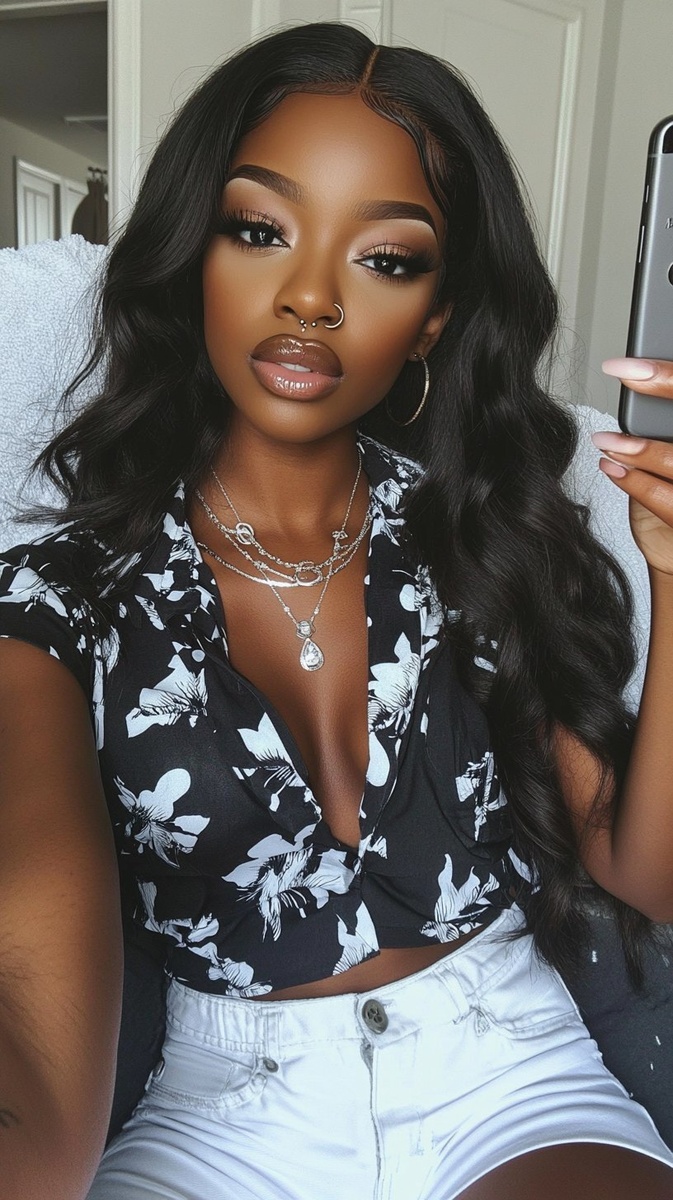 Создано на основе запроса: An African American woman, wearing white shorts and a black printed shirt with shoulder pads, a nose ring, a diamond necklace, flawless makeup, and long wavy hair extensions, taking a selfie on an iPhone 8 Plus. --- Автоперевод: Афроамериканская женщина, одетая в белые шорты и черная рубашка с принтом с плечами, носовое кольцо, бриллиантовое ожерелье, безупречный макияж и длинные волнистые наращивания волос, снимая селфи на iPhone 8 Plus. Круто получилось? 🤔 https://dzen.ru/id/65c0c65c86e4f837c27b24d7 #ИИ #AI #нейросеть #midjourney #art