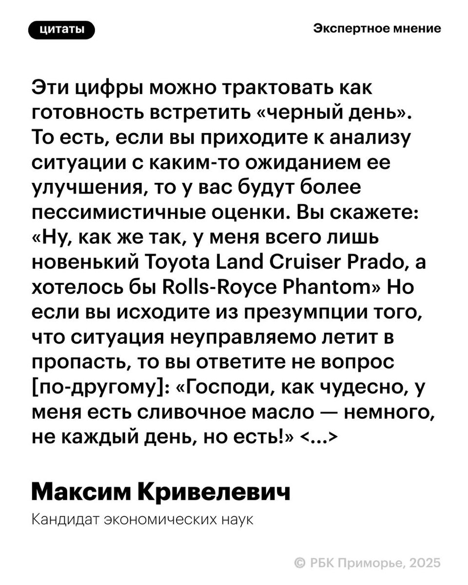 🤑В 2024 году 61,3% россиян были «вполне удовлетворены» имеющимися заработками и лишь 3,9% «совсем не удовлетворены» Таковы результаты комплексного наблюдения условий жизни населения, которое Росстат проводит каждые два года, начиная с 2011-го. За этот период доля довольных своими доходами жителей страны выросла в 2,3 раза, а в 2014 и 2024-м был отмечен особенно заметный рывок в этом отношении — сразу на 10,7 п.п. в оба периода. Экономист Максим Кривелевич в разговоре с РБК Приморье объяснил такую тенденцию эффектом заниженных ожиданий, предполагая, что сейчас россияне морально готовятся к «черному дню». 🍱Подписывайтесь на РБК Восток