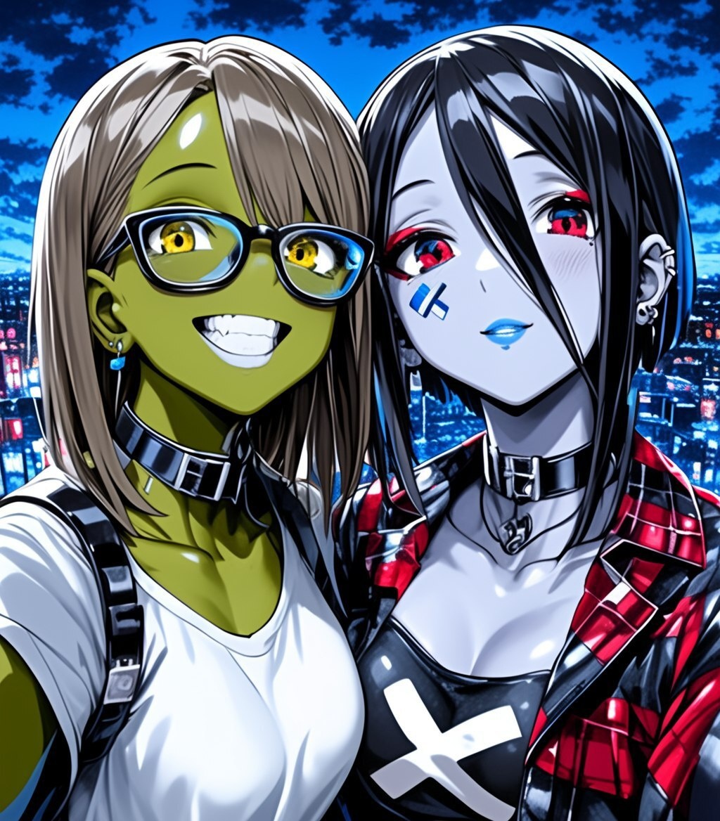 Создано на основе запроса: An anime-style illustration in the style of Yusuke Murata, depicting two female demons with long hair and glasses. One has green skin and yellow eyes, while the other has black skin and red eyes. They are posing together for a photo, with a city background at night. One wears a white shirt, and the other wears a jacket with an X on it. The overall impression is cute and happy. --- Автоперевод: Иллюстрация в стиле аниме в стиле Юсуке Мурата, изображающая двух женских демонов с длинными волосами и очками. Как тебе эта иллюстрация? 🤔 https://dzen.ru/id/65c0c65c86e4f837c27b24d7 #ИИ #AI #нейросеть #midjourney #art