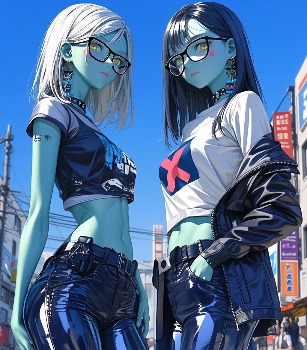 Создано на основе запроса: A cute green demon girl with yellow eyes and long black hair wearing glasses stands next to an adult woman in her thirties. The woman has a red X on her cheek, and is wearing a white shirt and a dark jacket. The scene is set against a city background, in an anime style.