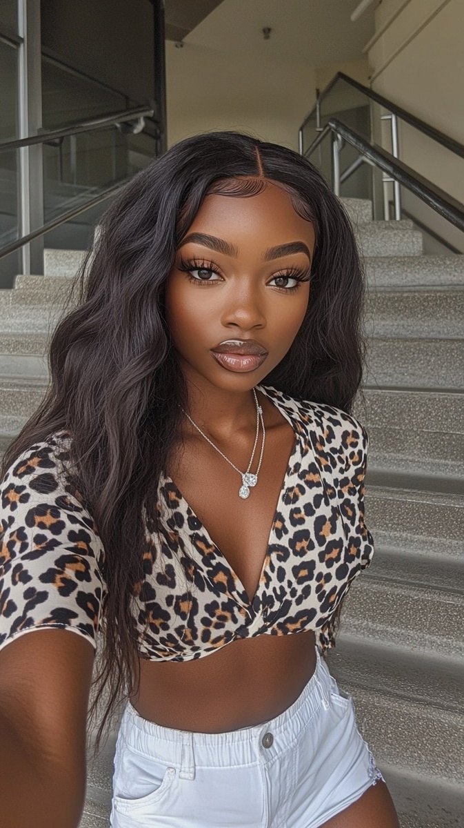 Создано на основе запроса: An African American woman, wearing white shorts and a black and silver leopard print cropped blouse, is taking a selfie on school stairs. She has long, wavy hair with baby hairs at the edges, flawless makeup, and diamond jewelry. Her lips are full and glossy. --- Автоперевод: Афроамериканская женщина, одетая в белые шорты и черно -серебряную укороченную блузку леопарда, делает селфи на школьной лестнице. Отлично вышло? 🤔 https://dzen.ru/id/65c0c65c86e4f837c27b24d7 #ИИ #AI #нейросеть #midjourney #art