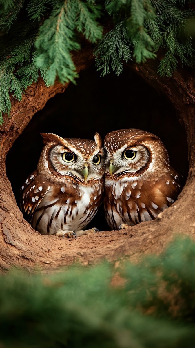 Создано на основе запроса: Two stunning owls, deep in a Washington State Forest, perched in a large hole inside of a pine tree , Fiber Optic