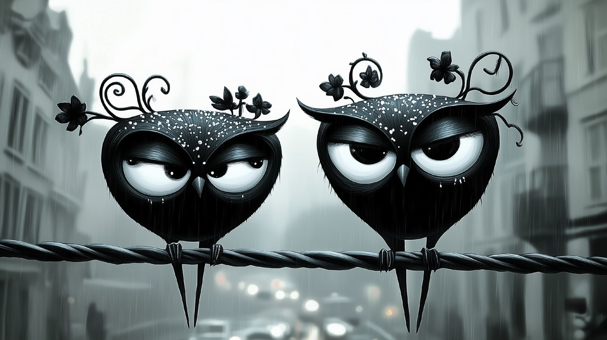 Создано на основе запроса: truth or lies. whimsecal fiber optic floral owls sitting on a cable above on a rainy evening in london
