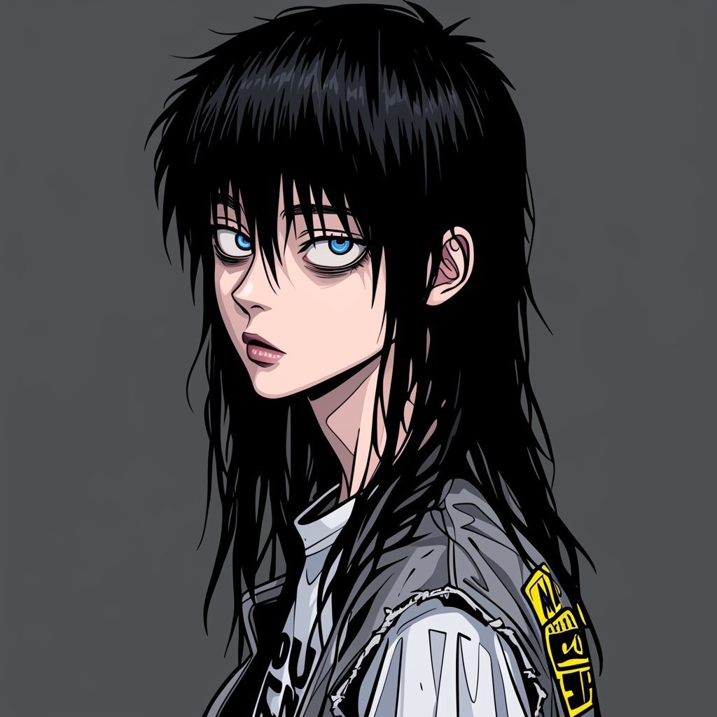 Создано на основе запроса: side profile portrait Katsuhiro Otomo - Akira style of a cyberpunk rebel with long tangled black hair and glowing blue irises, wearing a torn grey sleeveless vest layered over a faded band tee with analog port patches sewn into the shoulders, looking to the left, high contrast cel-shading, deep facial shadows, clean grey background, sketchy Otomo-style linework