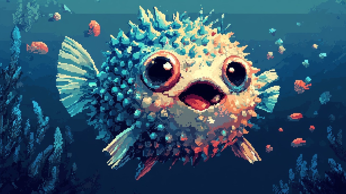 Создано на основе запроса: A professional training cover in pixel art style. The design features a mature pufferfish (baiacu adulto) in pixel art with a friendly yet professional expression. The color palette includes deep blue (#0077B6, #0096C7) and turquoise (#00B4D8), combined with soft neutral tones (#CAF0F8, #ADE8F4) for a clean and modern aesthetic. The background is simple but visually engaging, incorporating subtle gradients or geometric pixel art patterns to add depth while keeping the focus on the pufferfish. The overall design is balanced, ensuring a creative yet professional look suitable for a high-quality training program. --- Автоперевод: Профессиональная подготовка в стиле Pixel Art. Как тебе такой вариант? 🤔 https://dzen.ru/id/65c0c65c86e4f837c27b24d7 #ИИ #AI #нейросеть #midjourney #art