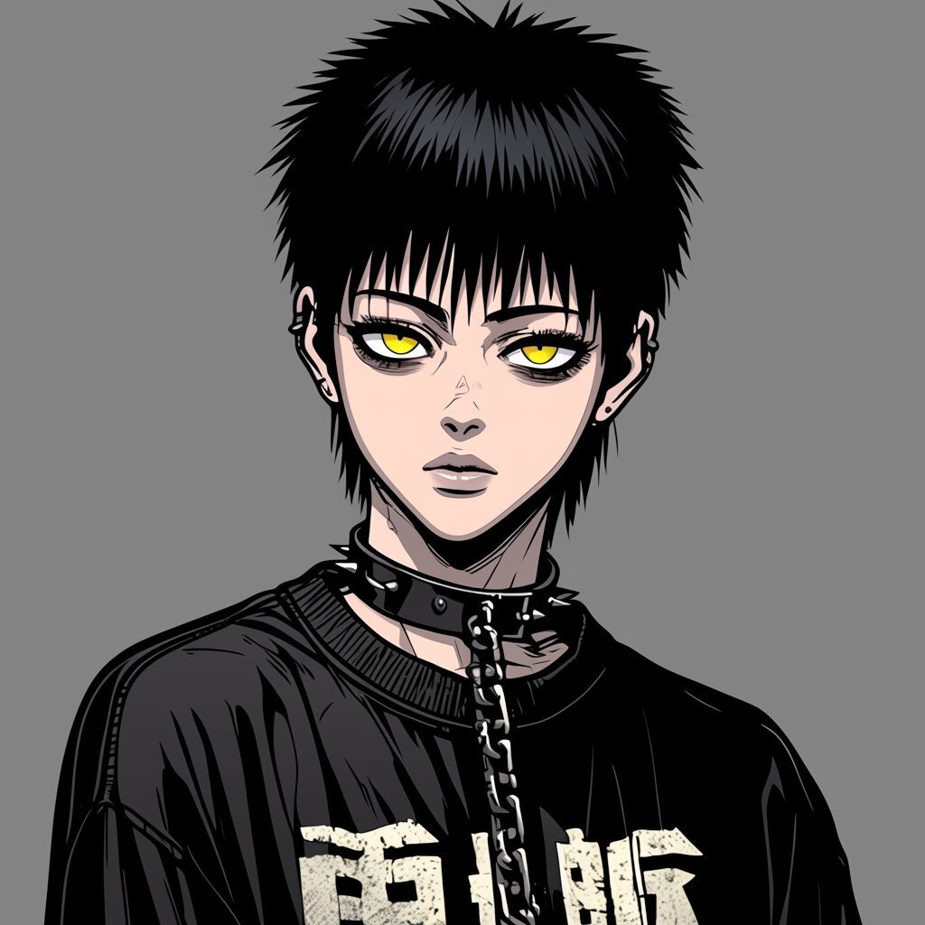 Создано на основе запроса: profile portrait looking directly at the camera, Katsuhiro Otomo - Akira style of a young punk girl with sharp yellow eyes and choppy black hair, wearing a chain collar and layered black shirt with a broken zipper, intense expression with slight tilt in the head, gritty cel-shading, clean grey background