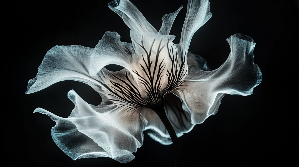 Создано на основе запроса: beautiful dark space, macro shot lens, filled with of iris van herpen flower, moodily lit, glowing pale biolumescent, growing out of black