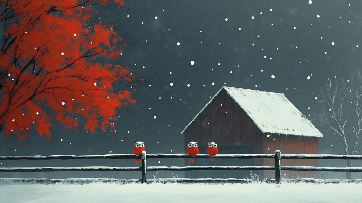 Создано на основе запроса: whimsecal fiber optic floral owls sitting on a fence in the winter near a barn and snowing