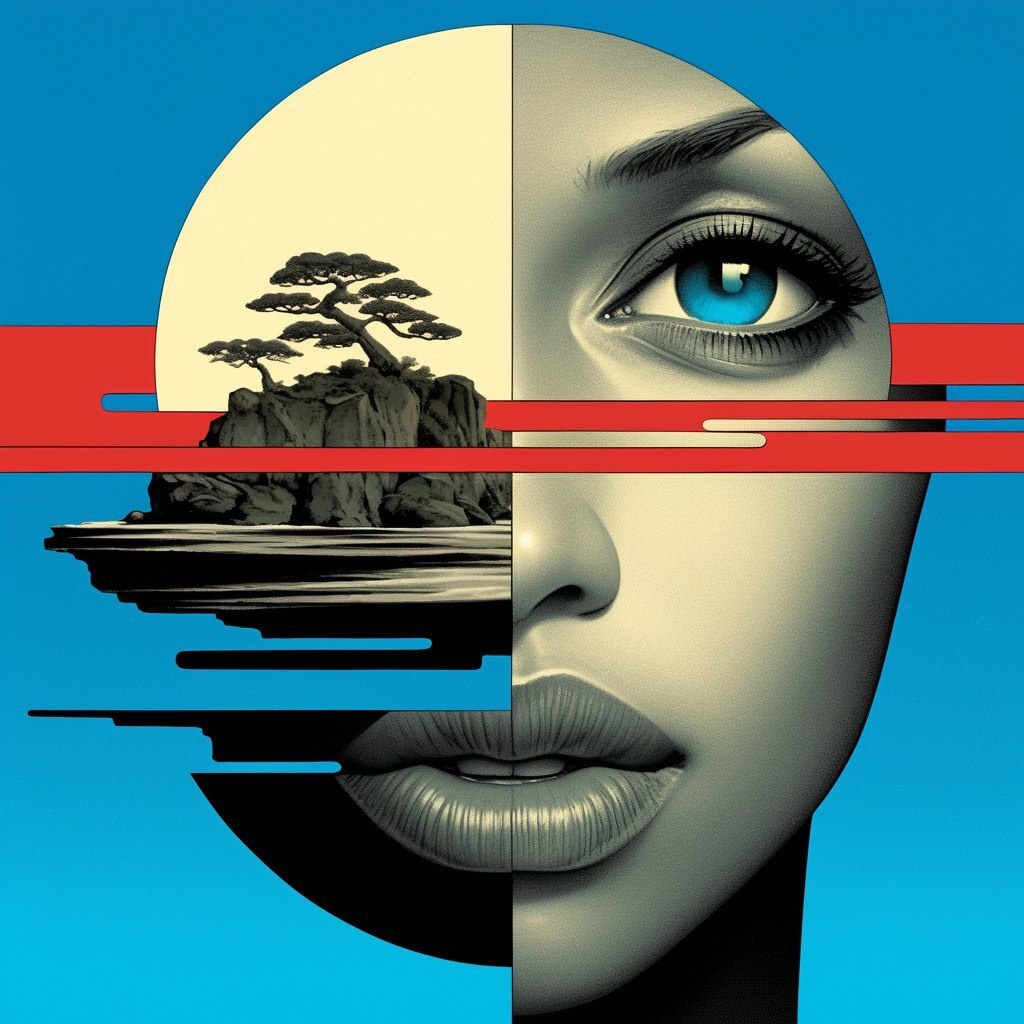 Создано на основе запроса: A Black woman with blue eyes and smooth skin. In the center of her head is an old Japanese tea house floating on water, with bonsai trees growing out from inside each eye and nose. Two red lines connect to a single white moon over a black sky, against a dark cyan background, in the style of James Jean illustration. Highly detailed and clean. --- Автоперевод: Черная женщина с голубыми глазами и гладкой кожей. Какое твое впечатление? 🤔 https://dzen.ru/id/65c0c65c86e4f837c27b24d7 #ИИ #AI #нейросеть #midjourney #art