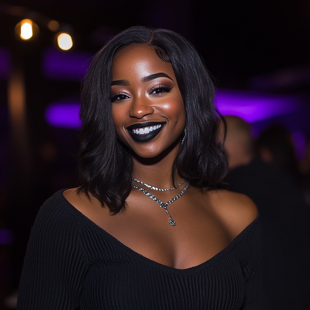 Создано на основе запроса: A photo of an African American woman with shoulder-length hair, smiling and posing for the camera at her bachelorette party. She is wearing a black sweater, black lipstick, and a silver necklace, with purple lighting. --- Автоперевод: Фотография афроамериканской женщины с волосами до плеча, улыбающейся и позирующей для камеры на ее девичнике. Интересно вышло? 🤔 https://dzen.ru/id/65c0c65c86e4f837c27b24d7 #ИИ #AI #нейросеть #midjourney #art