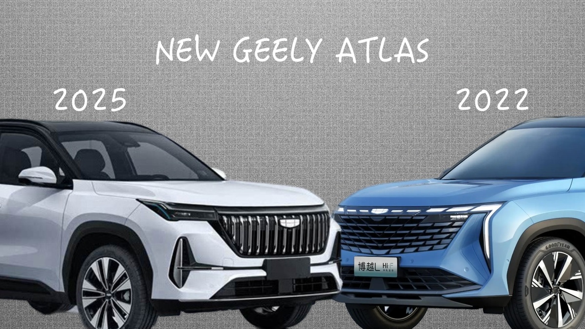 Новый/обновленный Geely Atlas получил полностью новую внешность. Вместо компактных секций в виде бумерангов, интегрированных в решетку радиатора со светящимся логотипом по центру, теперь классические фары, решетка радиатора по форме осталась прежней, но элементы внутри вместо горизонтальных полосок превратились в вертикальные хромированные «зубы». Также полностью изменился бампер.