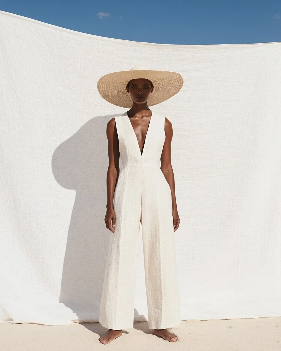 Создано на основе запроса: Wide shot of a tan model wearing a cream-coloured linen jumpsuit with wide legs. She is standing in front of a cloth background set in the desert. She is wearing a tan-coloured hat with very wide brim. The model is looking at the camera. and the sunlight is position to the left of the model. make the background clear --- Автоперевод: Широкий снимок коричневой модели с льняным комбинезом кремового цвета с широкими ногами. Интересно выглядит? 🤔 https://dzen.ru/id/65c0c65c86e4f837c27b24d7 #ИИ #AI #нейросеть #midjourney #art