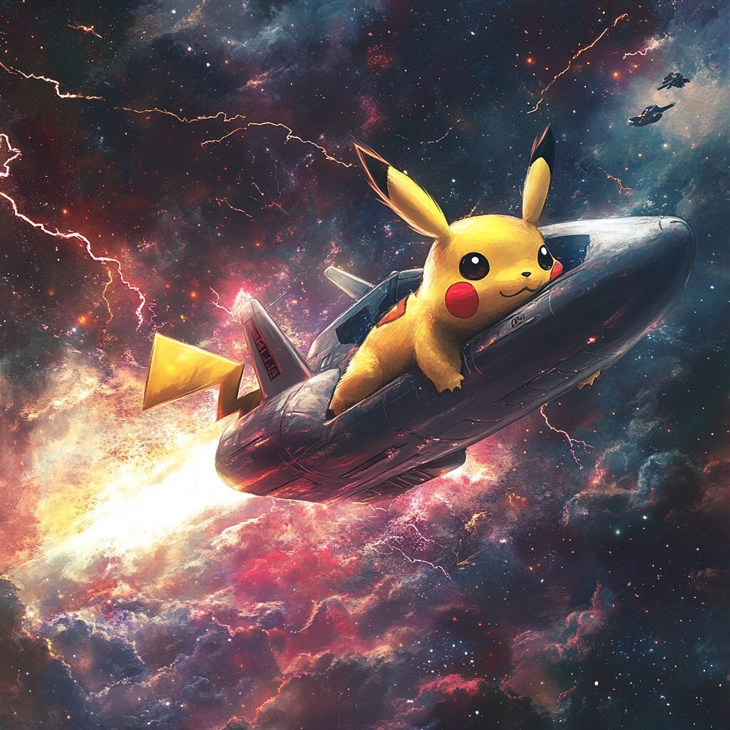 Создано на основе запроса: A Pikachu flying a space shuttle with lightning all around and a nebula nearby
