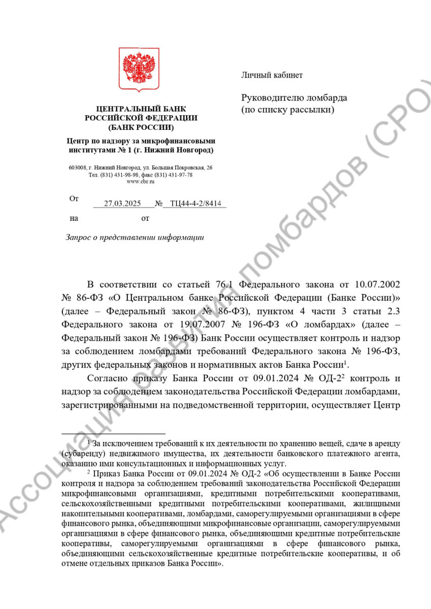 ЦБ не нравится, что ломбарды принимают в залог изделия без клейм. Ассоциация развития ломбардов поделилась необычным запросом от ЦБ. В запросе регулятор ссылаясь на сообщение ростовского МРУ ФПП, упрекает ломбарды в приеме в залог изделия, у которых нет оттисков государственных пробирных клейм. ЦБ высказывает предположение, что данные факты могут свидетельствовать о вовлечении ломбардов в легализацию ювелирных изделий из сферы «теневого» оборота, говорит о "недостатках в процедурах внутреннего контроля ломбарда при проведении оценки принимаемых в залог изделий из драгоценных металлов / их проверки на подлинность и наличие надлежащих государственных пробирных клейм". Направление ломбардом на маркировку и клеймение изделий при продаже - это обязанность ломбарда по Постановлению №270. (прим. ред.) Далее ЦБ предлагает ломбарду проводить "мероприятия, направленных на повышение эффективности процедур контроля принимаемых в залог ювелирных изделий, выявление причин, повлекших прием ю