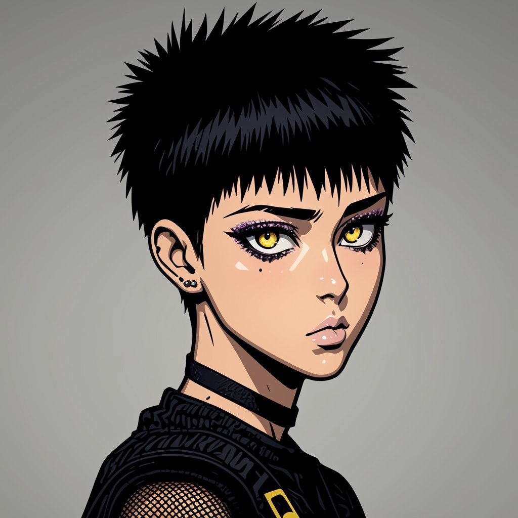 Создано на основе запроса: profile portrait looking directly at the camera, Katsuhiro Otomo - Akira style of a punk girl with piercing yellow eyes and short jagged hair, wearing a sheer black mesh long-sleeve top layered under a cropped vest, subtle glitter makeup and strong glare, bold cel-shading with Otomo-style ink crosshatching, clean grey background