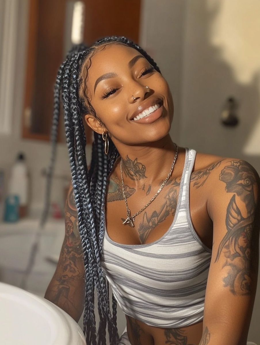 Создано на основе запроса: Selfie of an African woman sitting on the edge of her sink, wearing a striped white and grey tank top with shoulder straps. She has long braids in her hair, smiling at herself in the mirror, with tattoos visible down her neck to her chest. Her skin tone is natural.