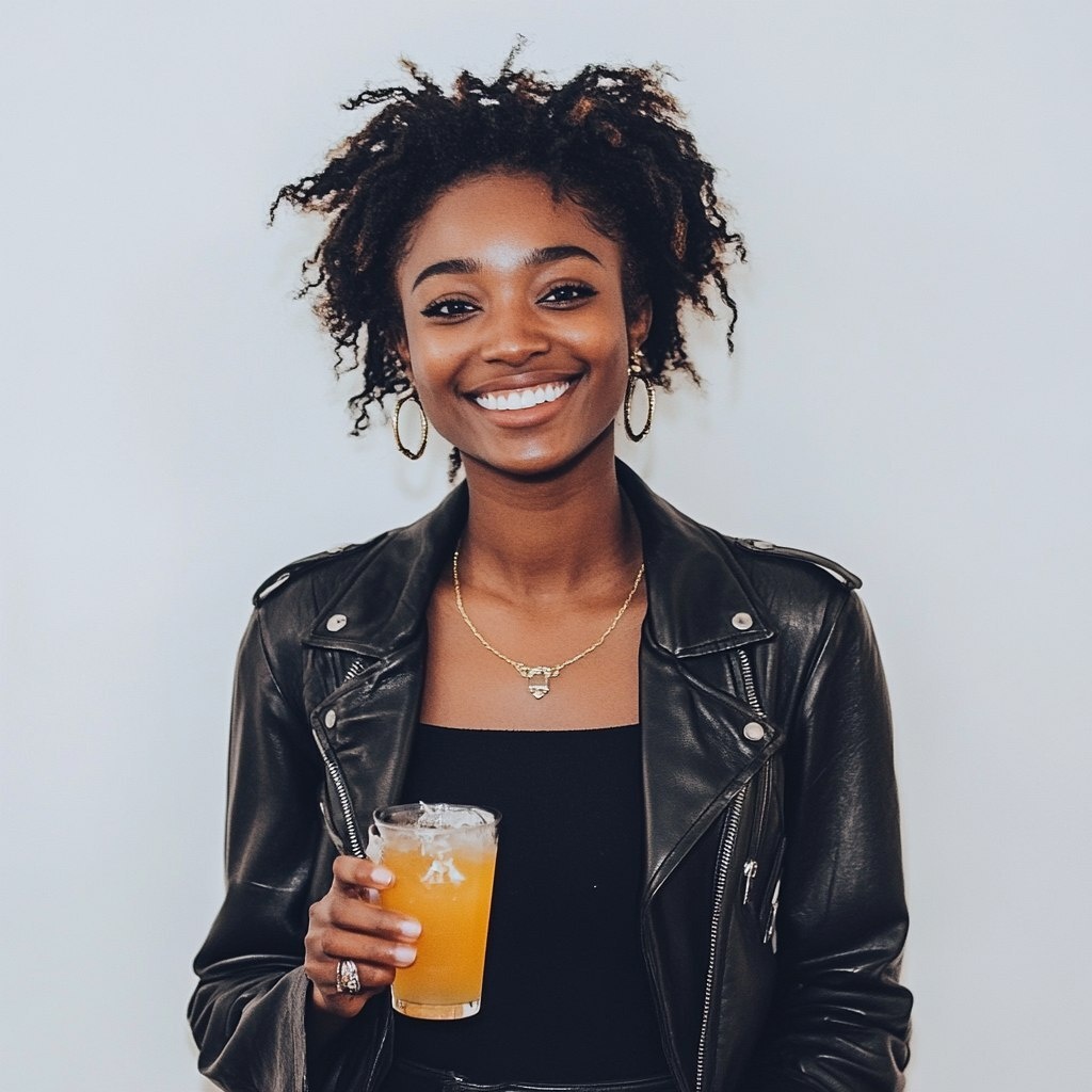 Создано на основе запроса: Photo of an African American woman in a black leather jacket, smiling and holding a drink at an office party
