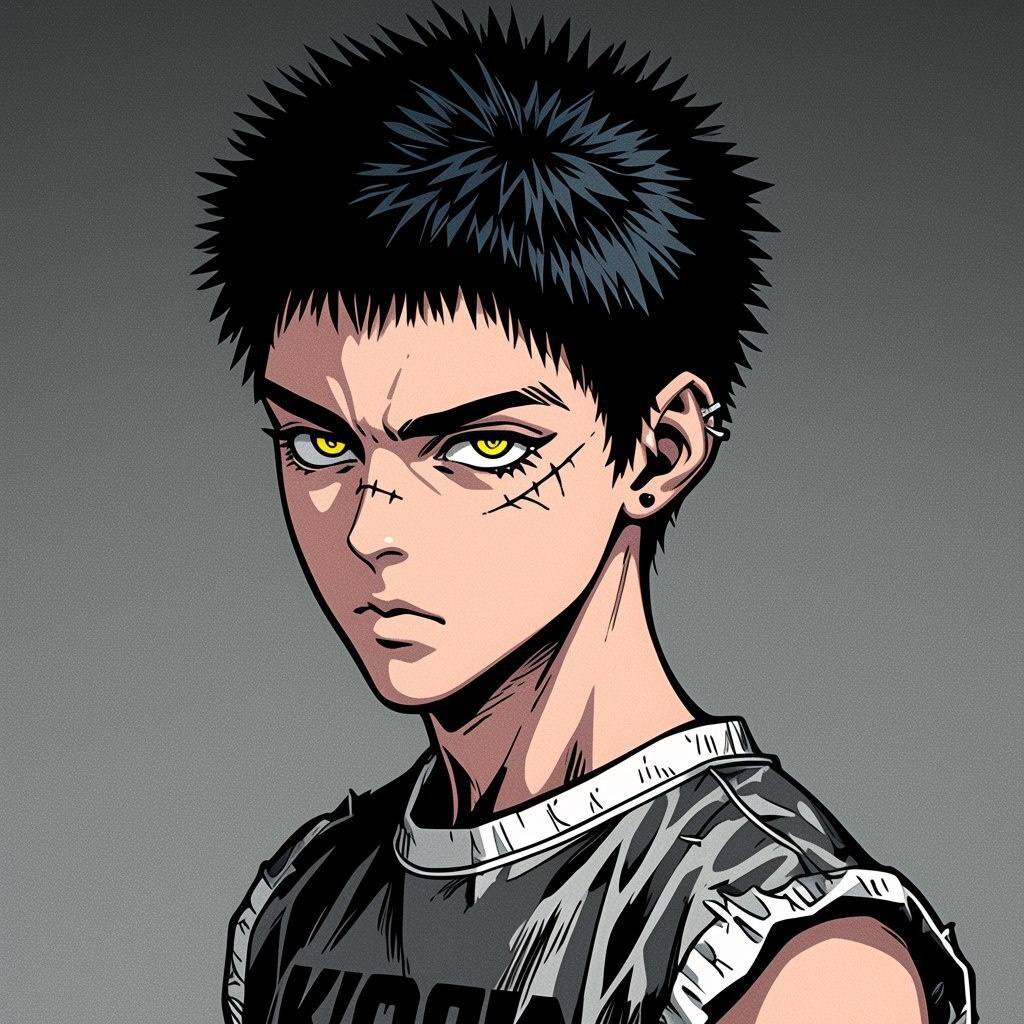 Создано на основе запроса: profile portrait looking directly at the camera, Katsuhiro Otomo - Akira style of a tough punk with wild shoulder-length hair and piercing yellow eyes, wearing a faded sleeveless tee with cracked band logo and curled collar edges, subtle eyebrow cut and sharp shadow under the nose, crisp ink texture, clean grey background --- Автоперевод: Портрет профиля, смотрящий прямо на камеру, Кацухиро Отомо - стиль крепкого панка с дикими волосами до плеч и пронзительные желтые глаза, одетые в тройку с выцветшей без рукавов с треснутым логотипом полосы и кожи Красиво выглядит? 🤔 https://dzen.ru/id/65c0c65c86e4f837c27b24d7 #ИИ #AI #нейросеть #midjourney #art