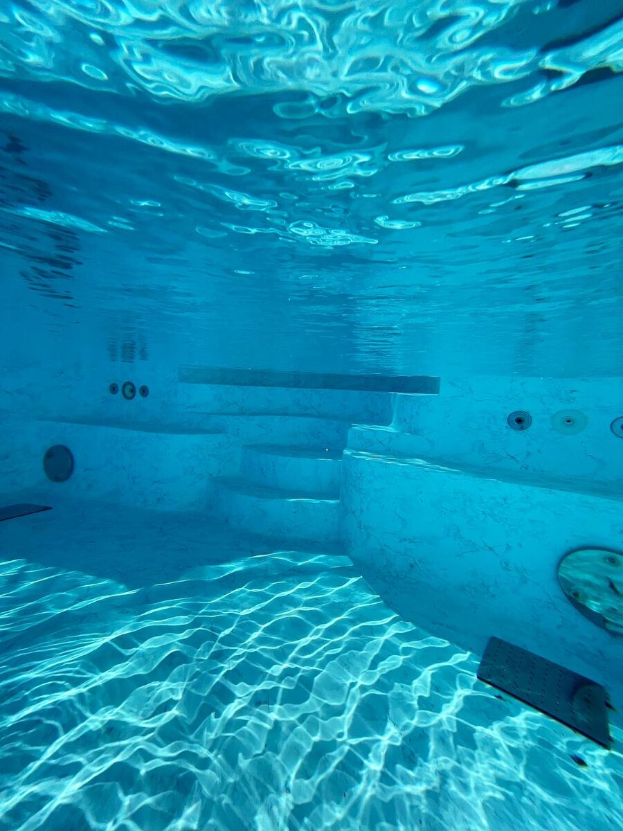 Вид изнутри. ⠀ Так выглядит бассейн, облицованный лайнером пвх белого цвета с фактурным покрытием, под водой. ⠀ Блики, игра света и цвета. Никакой монотонности. ⠀ Но самый важный фактор этой красоты – кристально чистая вода! ⠀ На фото наш бассейн на б/о «Даховская Слобода», в районе Лагонаки. Рекомендуем к плаванию )