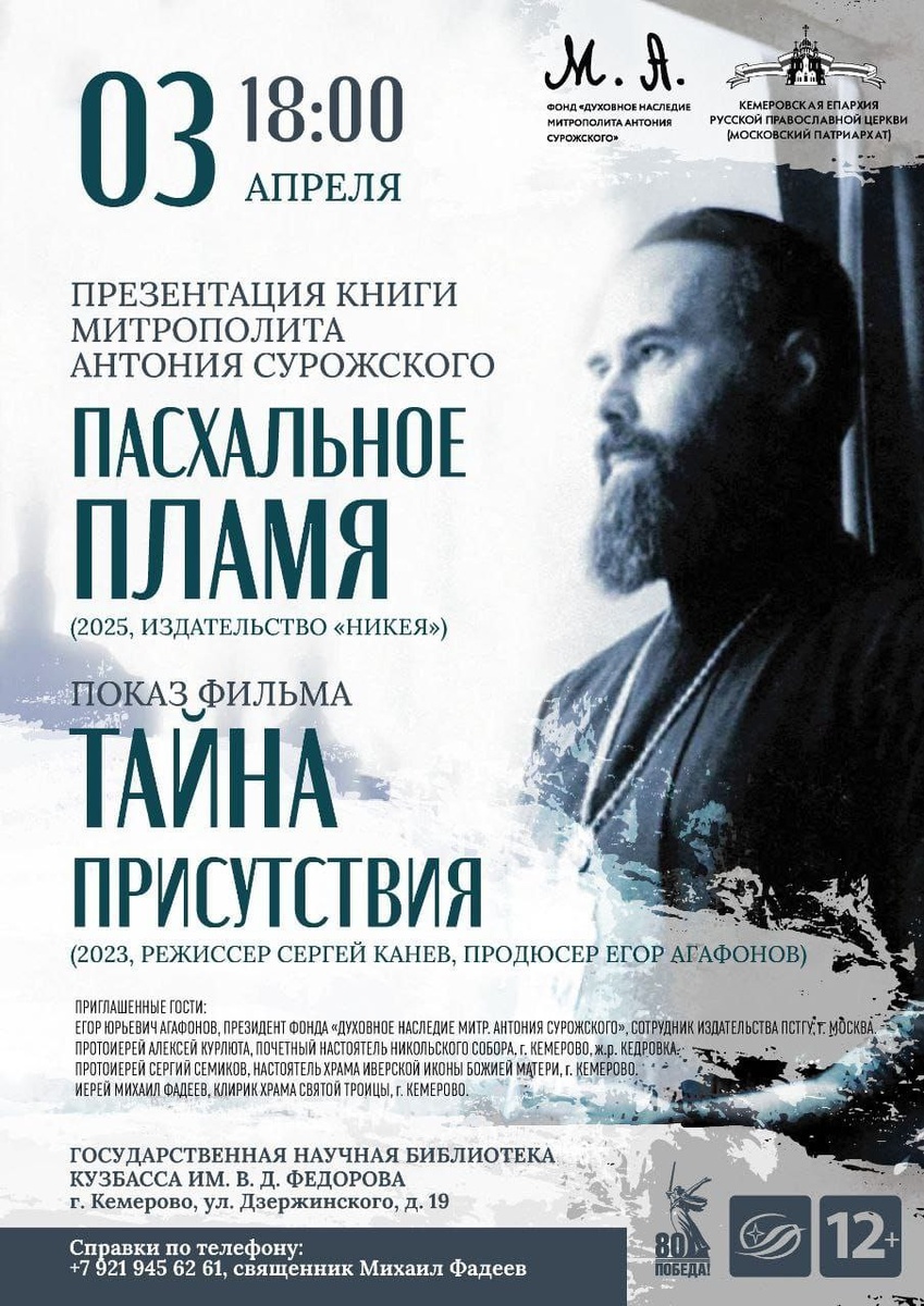 Дорогие друзья! Сегодня вечером в 18.00 в областной научной библиотеке им. Федорова пройдет презентация книги митрополита Антония Сурожского "Пасхальное пламя" и показ фильма о жизни митрополита Антония "Тайна присутствия". Приглашаю всех желающих кемеровчан принять участие, и сам там буду. Приходите, и приводите друзей и знакомых.