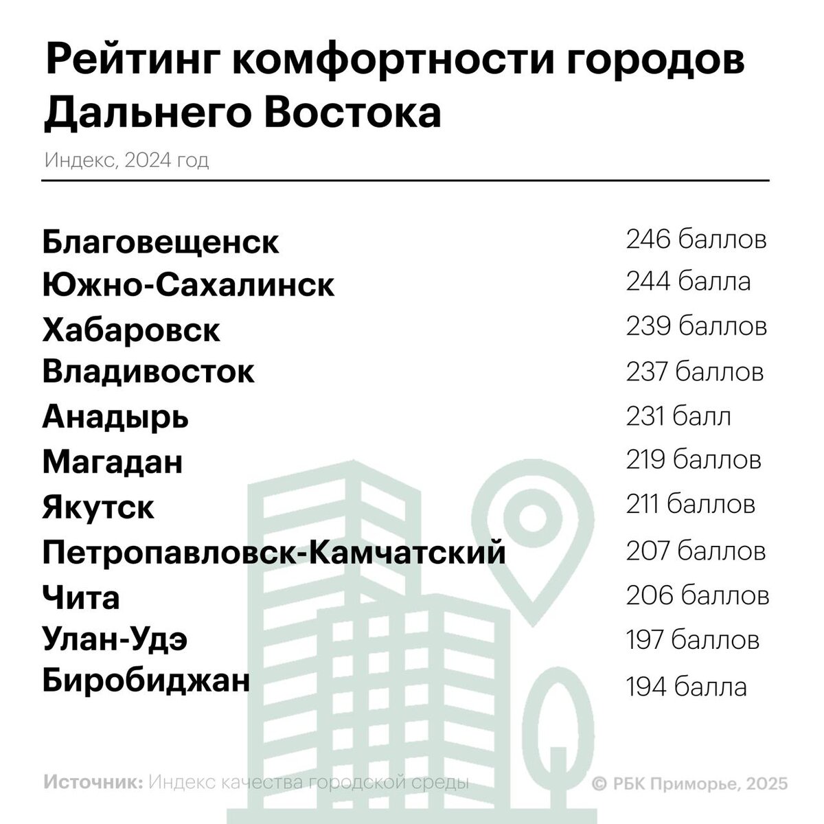 📈 Благовещенск оказался самым комфортным городом среди столиц ДФО Индекс комфортной городской среды, по итогам 2024 года, составил 246 баллов, за год столица Приамурья прибавила 33 балла. Два крупных города Дальнего Востока Хабаровск и Владивосток по комфорту городской среды идут почти в ногу: они набрали 239 и 237 баллов соответственно, прибавив за год по 20 баллов. Хабаровск также оказался самым густонаселенным городом ДФО — по данным аналитиков, здесь проживает 615,6 тыс. человек. 🍱Подписывайтесь на РБК Восток