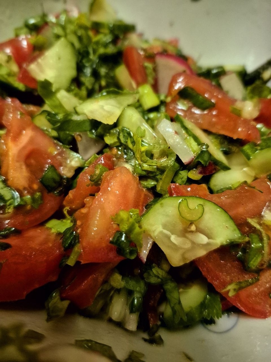 Весной всегда хочется уже свежих овощей, которые в изобилии начинаются появляться в магазинах и на рынках. Наша семья не является исключением и мы стараемся делать такой салат на ужин: и в качестве гарнира, и в качестве дополнительного блюда. Здесь все просто: режем овощи и зелень (количество, ассортимент, размеры нарезаемых кусочков овощей и зелени зависит от Ваших пожеланий) (я чаще всего использую помидоры, огурцы, редиску, кинзу и зеленый лук). Солим, перчим, добавляем растительное масло (я добавляю нерафинированное подсолнечное), все тщательно перемешиваем. Кушаем с удовольствием! Приятного аппетита!