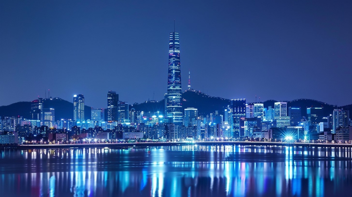 Создано на основе запроса: elegant futuristic city skyline at night, blurred background with soft light trails, subtle Korean architectural