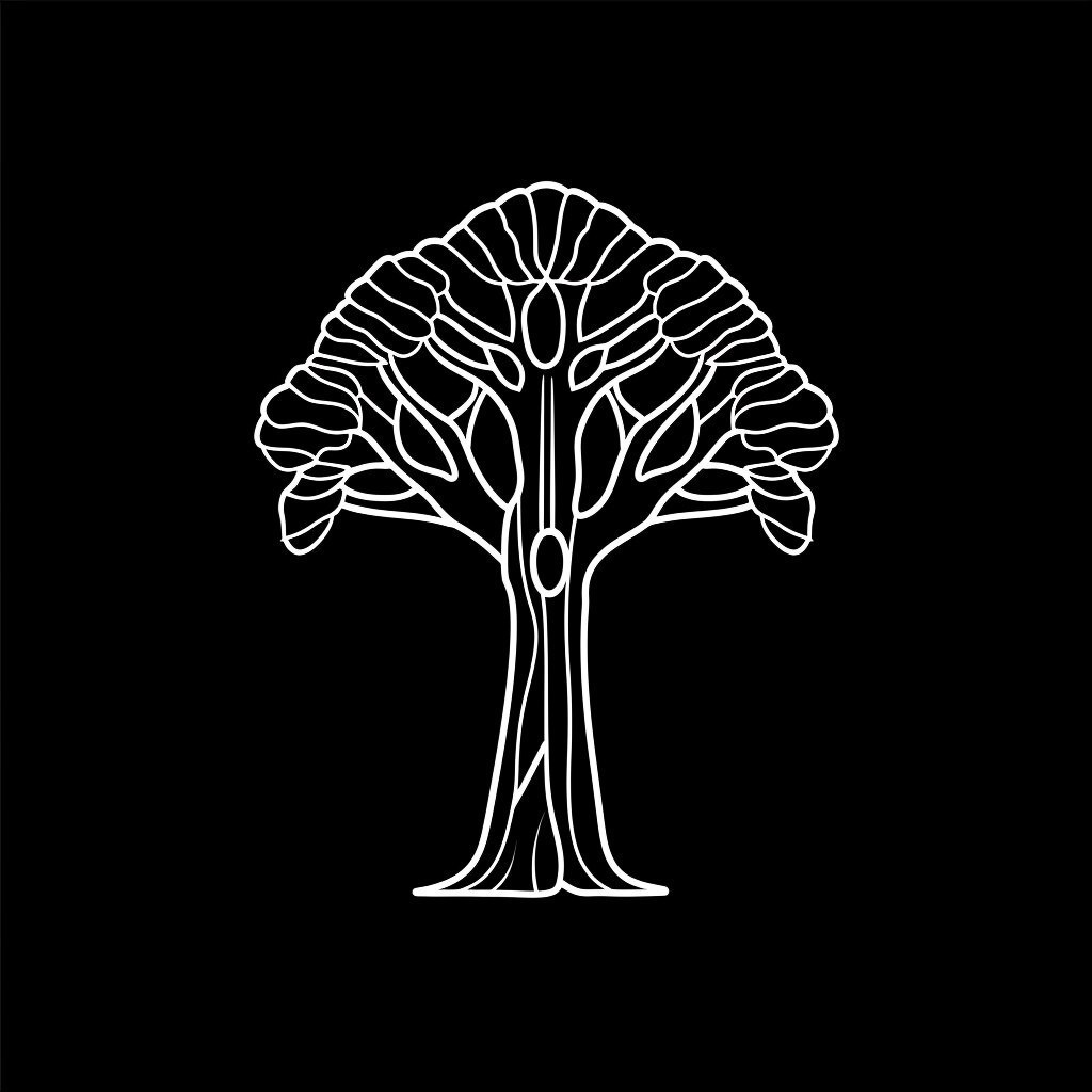 Создано на основе запроса: Black and white line art logo featuring a highly stylized baobab tree silhouette, extreme minimalism, clean