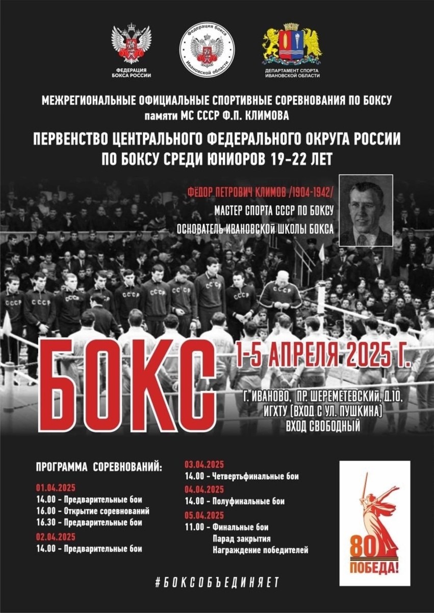 🥊1-5 апреля в Иванове пройдёт Первенство ЦФО по боксу среди юниоров 19-22 лет памяти мастера спорта СССР Фёдора Петровича КЛИМОВА (12+). 🔴В первенстве примут участие сильнейшие боксёры страны. Победители получат путевку на Чемпионат России 📍Место проведения: проспект Шереметевский, 10, спортивный зал ИГХТУ (учебный корпус Б, вход с ул. Пушкина). ❗5 апреля в 10.00 состоится мастер-класс с заслуженным мастером спорта СССР АНДРЕЕМ КУРНЯВКОЙ. Андрей Петрович Курнявка — советский и киргизский боксёр, выступал за сборную СССР. Неоднократный победитель международных турниров. Заслуженный мастер спорта СССР. Вице-президент Федерации бокса Москвы ЖДЁМ ВСЕХ поклонников бокса, спортсменов, тренеров и жителей города. ВХОД СВОБОДНЫЙ! #боксобъединяет Федерация бокса Ивановской области https://vk.com/club155617351