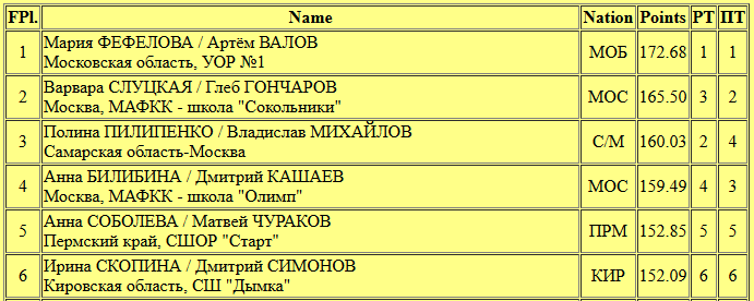 В танцах итоги оказались весьма ожидаемыми, но борьба за 3 место была очень упорной. В итоге можно поздравить с бронзой проводящих свой первый сезон вместе Полину Пилипенко/Владислава Михайлова (160.03 - 3 место🥉) из группы Елены Масленниковой. Серебро у еще одних дебютантов сезона, медийной пары с большой группой поддержки Варвара Слуцкая/Глеб Гончаров (165.50 - 2 место🥈) из группы Екатерины Рублевой. У бывшей партнерши Глеба Анны Румак зарубежная карьера пока не складывается, а вот Глеб терпеливо подтягивает до своего уровня Варю, которая впервые в этом сезоне получила третьи уровни за обе дорожки шагов. Впрочем, судейство на этом турнире в танцевальной дисциплине было достаточно лояльным и все лидеры дружно установили свои личные рекорды. Уверенную победу одержали мастеровитые не по годам Маша Фефелова/Артем Валов (172.68 - 1 место🥇) из группы Алексея Горшкова. Два прекрасных, безошибочных проката, с суммой баллов выше 170. С интересом продолжу следить за дальнейшим прогрессом этой талантливой пары.
