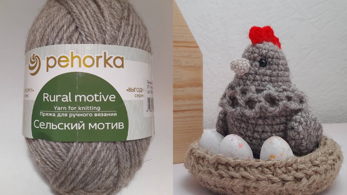 Купила в Fix Price пряжу "Сельский мотив" от Пехорки за 116р, и набор маленьких яиц за 69р (цены актуальны на момент выхода статьи). Пряжа мягкая, объёмная, тактильно приятная, колется, пахнет овечкой. Решила связать из неё курочку по описанию, которое полюбилось мне ещё в прошлом году (тогда вязала из "Детской новинки" и "Му Ваву"). Описание: Для курочки из "Сельского мотива" использовала крючок №3, глазки на безопасном креплении 5мм. Расскажу о том, что изменила. Тело: до 22 ряда по описанию (кроме 13ого: хвостик сделала из 5 сс1н), 23 ряд: (2 сбн, уб) х6; 24 ряд: (1 сбн, уб) х6; 25 ряд: 6 уб. За полупетли 9ого ряда: 1 ряд: впп, 3 вп, (сбн через 1, 3 вп) х 10. Так должно получиться 11 арок. 12ая: сбн, 1 вп, сс1н в впп в начале ряда. Всего 12 арок. 2 ряд: впп, 4 вп, (сбн в центр арки, 4 вп) х 11, завершить ряд сс в впп начала ряда. Глазки: 5мм, между 5ым и 6ым рядом. Глазки не ровно по центру спереди, а чуть левее ( или правее) центра, чтобы было ощущение, что голова повёрнута вбок