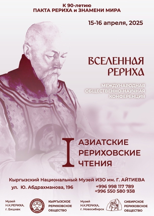 15–16 апреля 2025 г. в г. Бишкек (Кыргызстан) состоятся Первые Азиатские Рериховские Чтения «ВСЕЛЕННАЯ РЕРИХА». Международная общественно-научная конференция посвящена 90-летию Пакта Рериха и Знамени Мира. Организаторы: Музей Н.К. Рериха, г. Бишкек (Кыргызстан), Кыргызское Рериховское Общество, Музей Н.К. Рериха, г. Новосибирск (Россия). Конференция пройдёт в Кыргызском Национальном Музее Изобразительных Искусств им. Гапара Айтиева. Докладчики из Москвы, Новосибирска, Екатеринбурга, Тулы, Риги (Латвия) и Дели (Индия) раскроют следующие темы: ● «Философия культуры Рериха». ● «Принцип Красоты, как основа Бытия. Знак Знамени Мира в Искусстве и Религии». ● «Пакт Рериха и его актуальность в современном мире». ● «Грани понимания духовности в Учении Живой Этики». ● «Юрий Рерих и Тахары». ● «Мир Рериха в поэзии: Воспоминания о великом Мастере». ● «Живём для будущего о сотрудничестве З.Г. Фосдик и Н.Д. Спириной». ● «Аромотерапия в Учении Живой Этики». В дни работы конференции пройдёт творческая