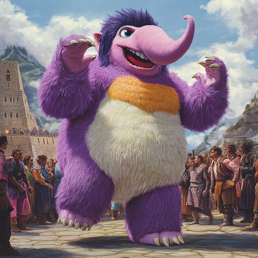Автоперевод: Пушистое существо с фиолетовым стволом, столь же высоким, как и человек, танцует с инковкими мужчинами и женщинами в пятнадцатом веке.