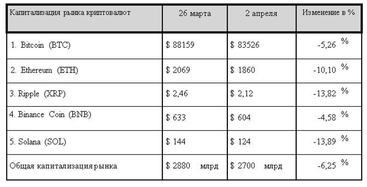 По итогам минувшего семидневного отчетного периода общая капитализация криптовалютного рынка осталась ниже психологической отметки $3 млрд. На вечер среды, 2 апреля 2025 года, она составила $2,7 трлн, что на 6,25% ниже значений, зафиксированных на конец прошлого отчетного периода.